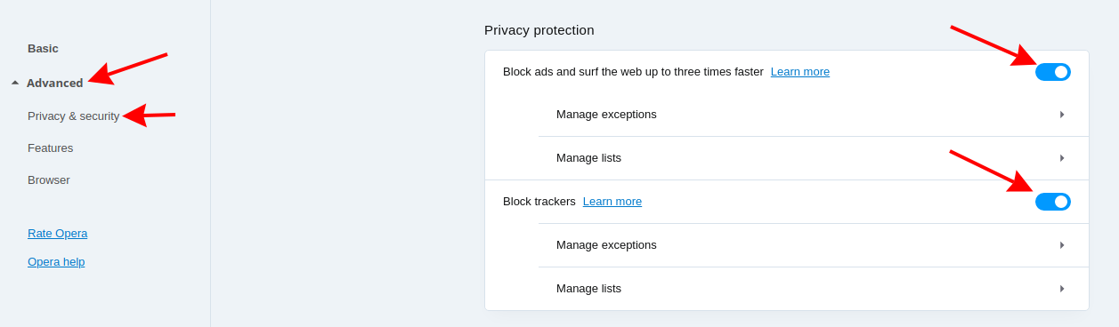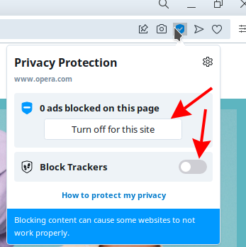 Now you will see the category "Privacy protection". Left click on the blue bars at "Block ads and surf the web up to three times faster" and "Block trackers". The blue bars will be grayed out.